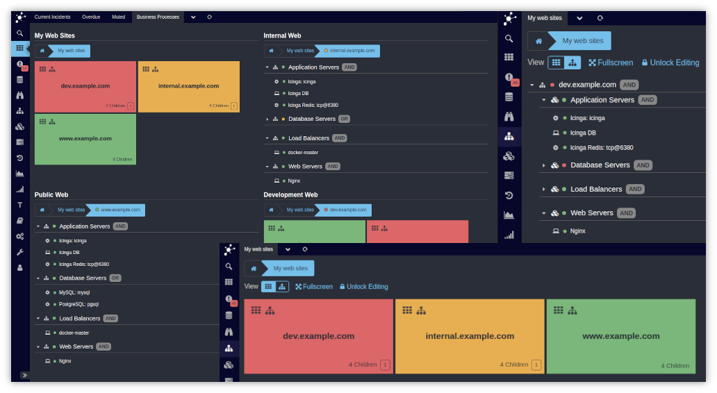 If you want to visualize and monitor hierarchical business processes based on any or all objects monitored by Icinga, the Icinga Web 2 business process module is the way to go.
